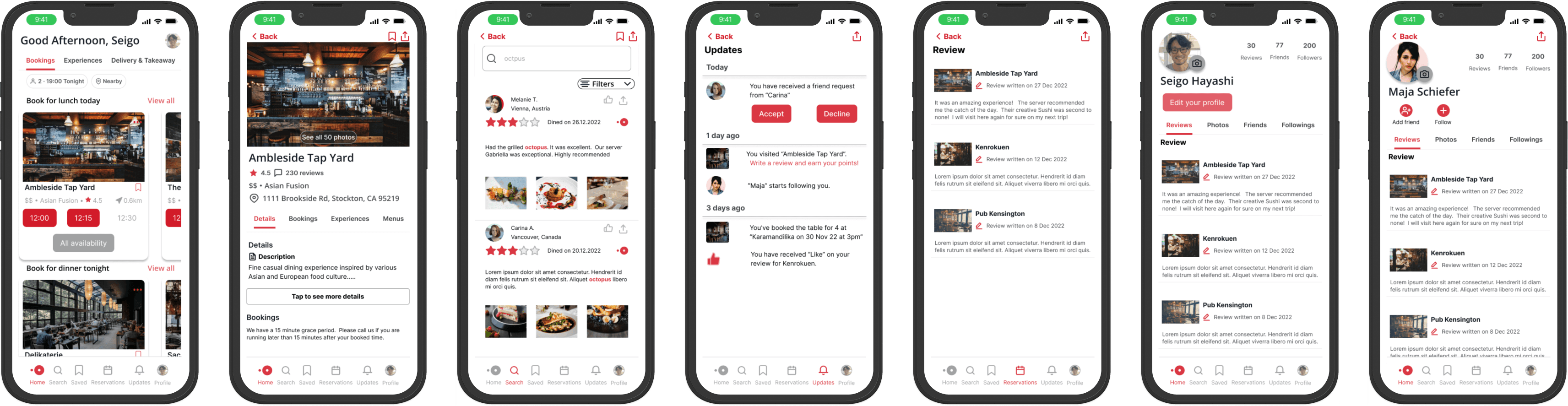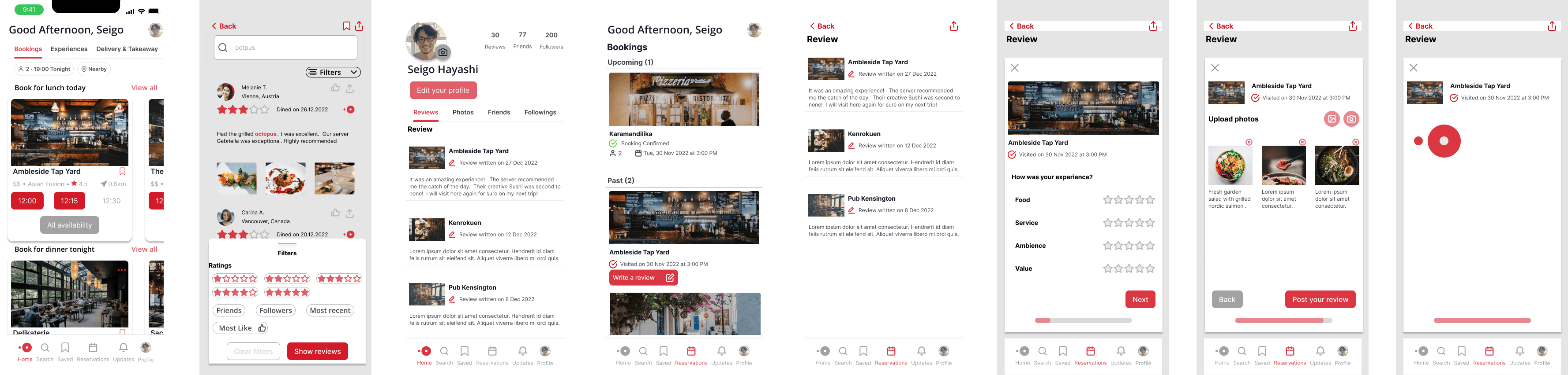 You can search for a restaurant and book a table through the App; however, It is still skeptical if reviews are trustable. With that in mind, I teamed up with another designer to iterate on improving review functions. Our goal : Users can connect with their friends and be confident enough to book a table.