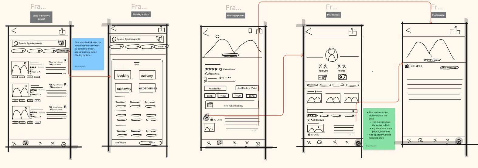 We came up with the solutions by adding features to connect with their friends, follow other users, and improve a more personalized profile page and settings. We think being able to search for a review with keywords, and filtering more options such as based on friends and followers as well as ratings would make it easier for a user to obtain the information.