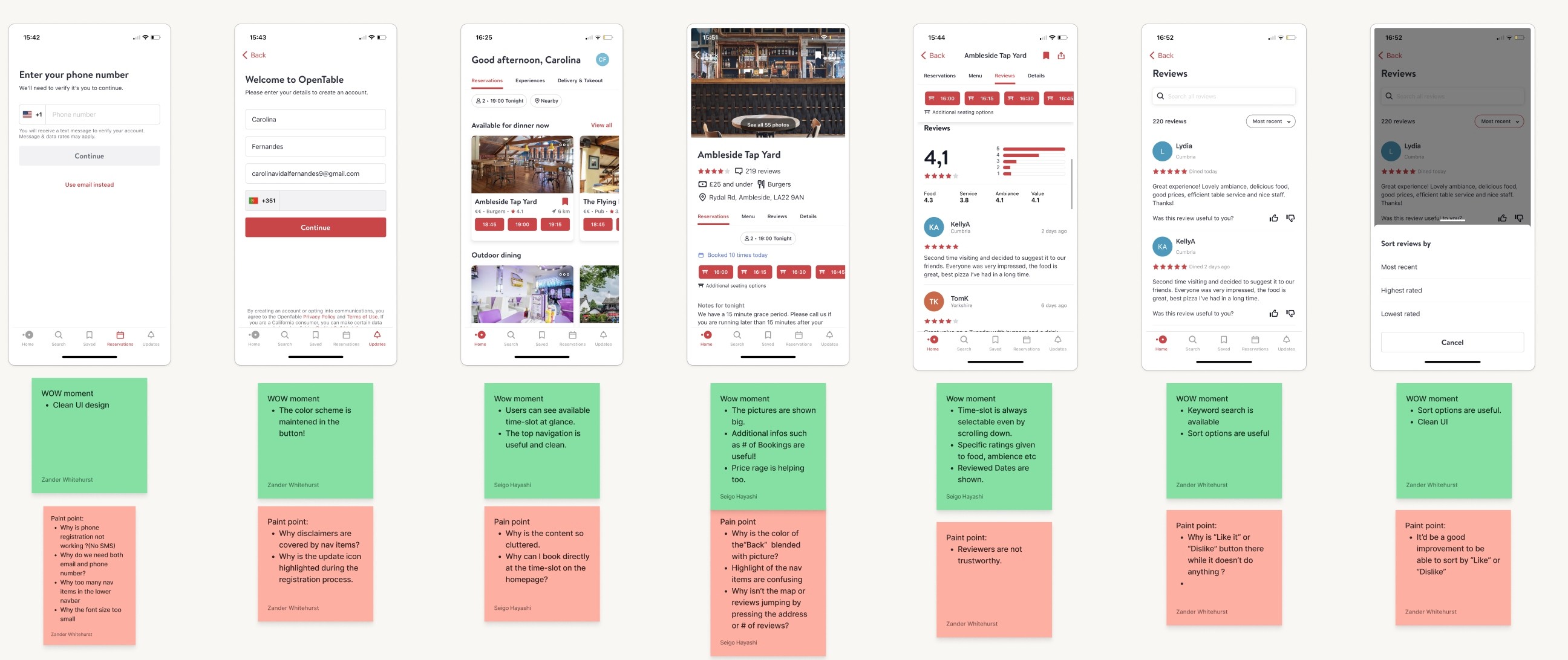 At first, we conducted the usability audit to familiarise ourselves with how the current App flows from the onboarding process, finding restaurants, reviewing, and booking a table. We discovered that there are some good features we shall keep such as easy-booking availabilities and bigger hero photos to attract the users. At the same time, we came up with some areas of improvement such as the effective use of the "Like, Dislike" icons, personalized profile page, photo in an avatar, filter options, showing reviews from friends and followers, and accessibilities.
