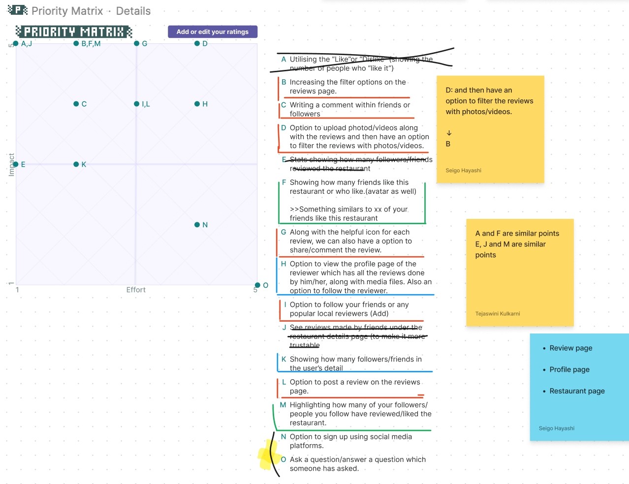 While working on this process, we set up a meeting with our teaching assistant. We wanted to understand how much we could implement for this case study. We were questioned about what has to consider when adding new features or improving features. As a product designer, it was a great key learning to take it into consideration that "adding features" costs financially and time. Therefore, we could focus on improving the existing features and minimize adding new features.